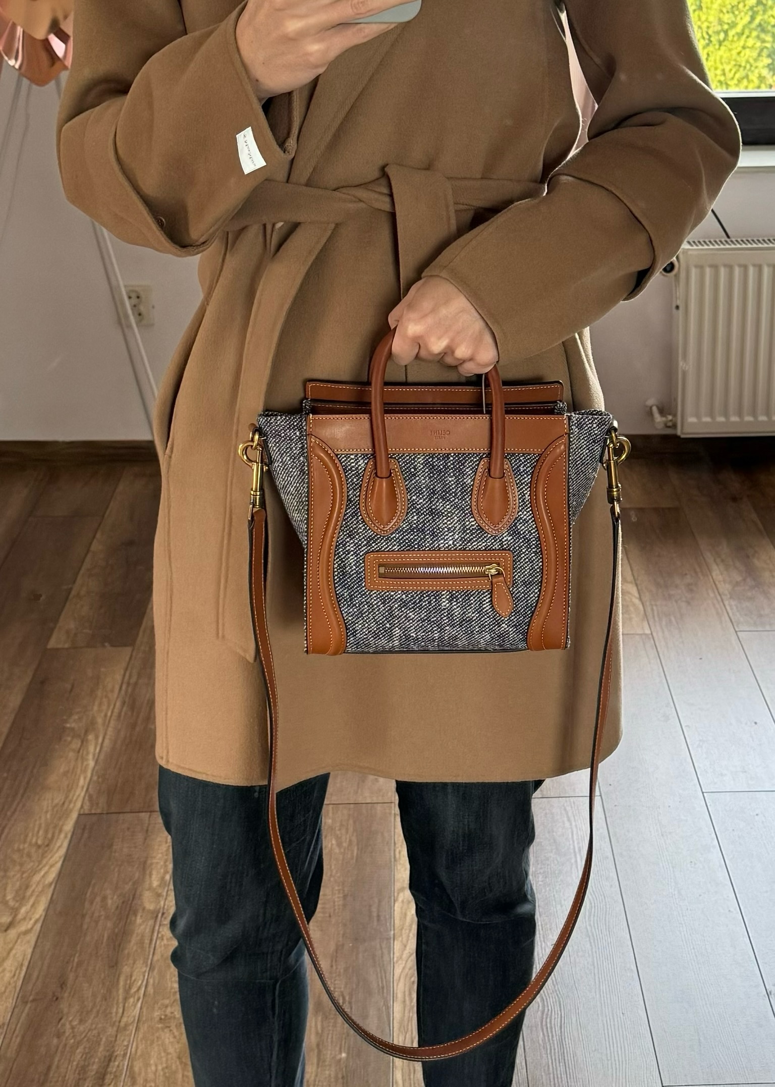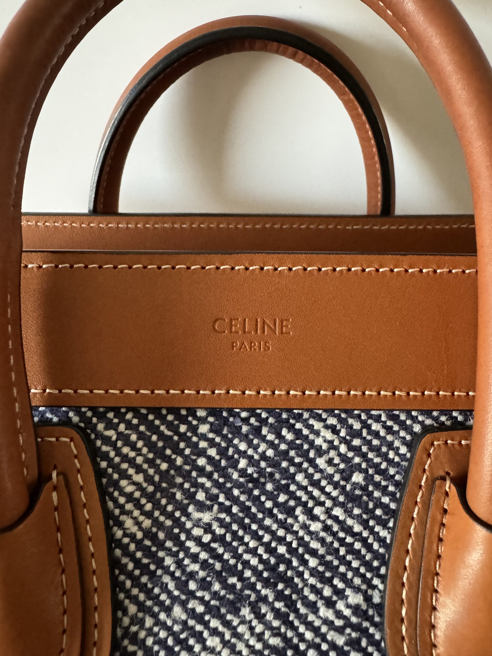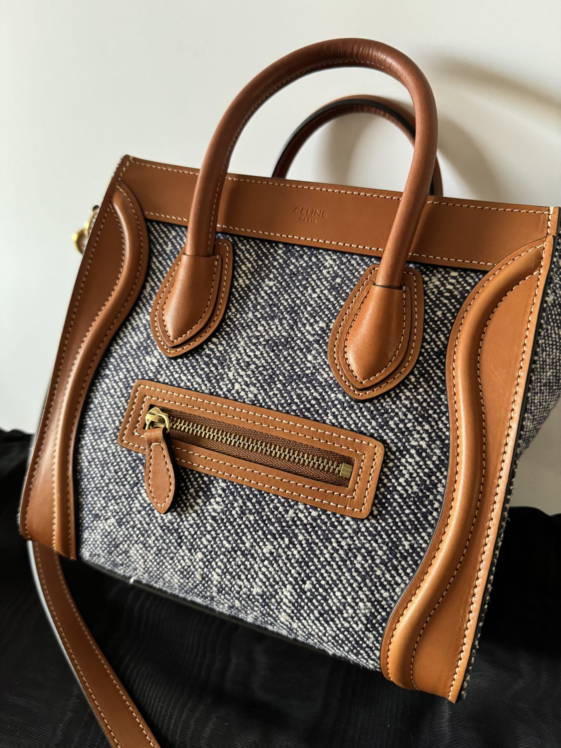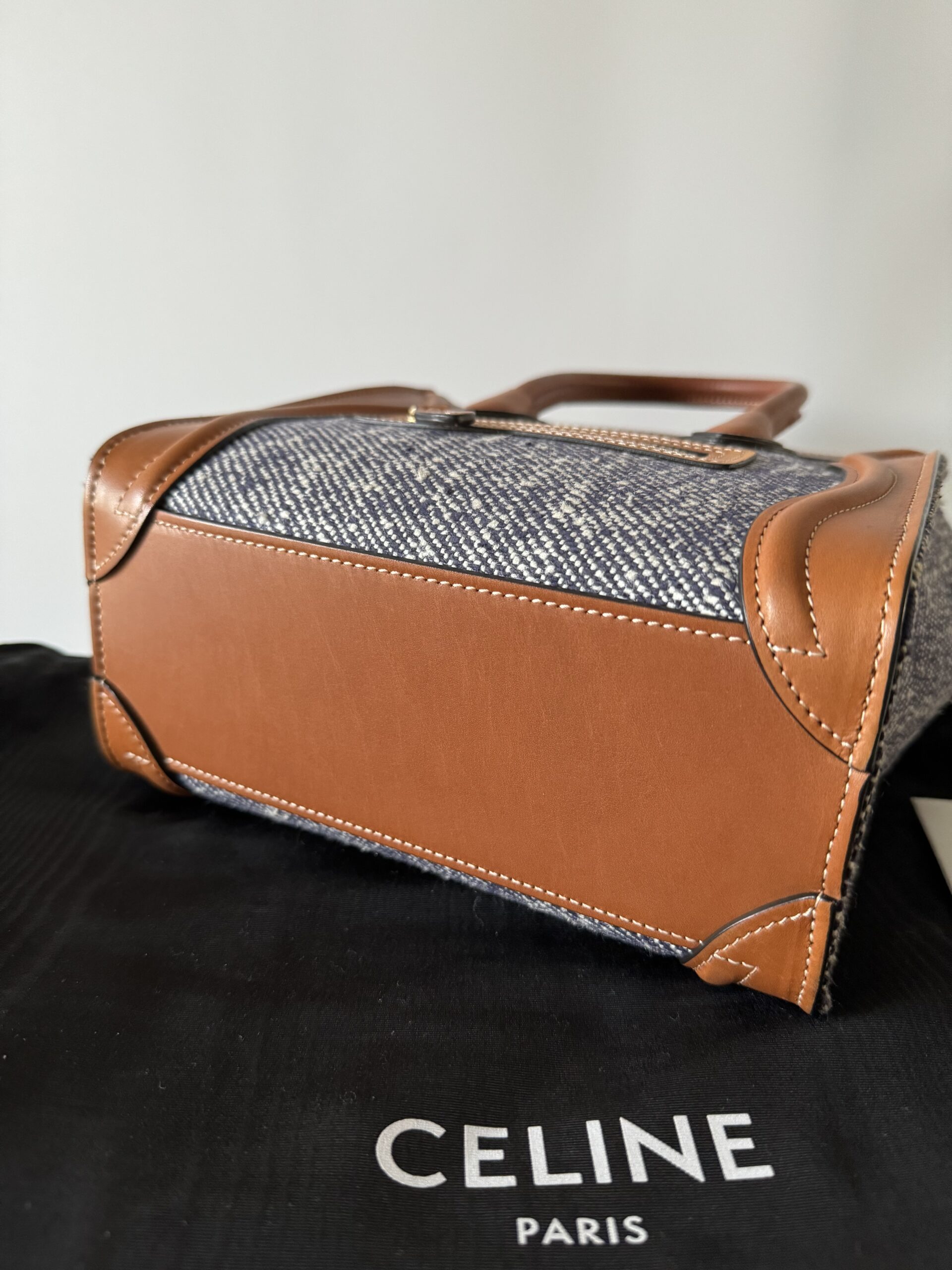 ▪️ Piękna torebka, ikoniczny model Celine, wykonana z połączenia skóry cielęcej w kolorze TAN (karmelowym) oraz płótna imitującego dżins w kolorze NAVY (bardzo ciemny, niemalże czarny melanż z białym).