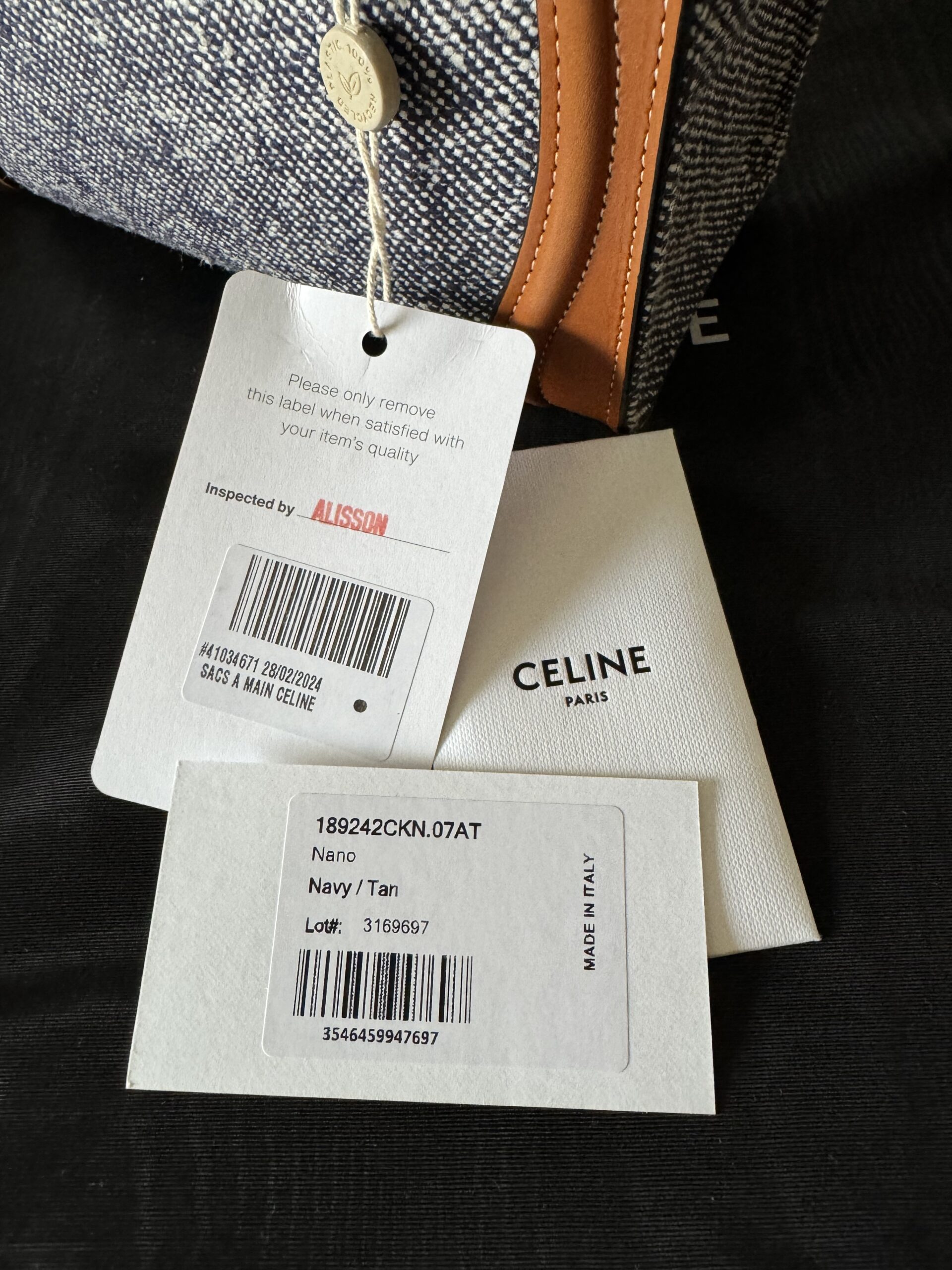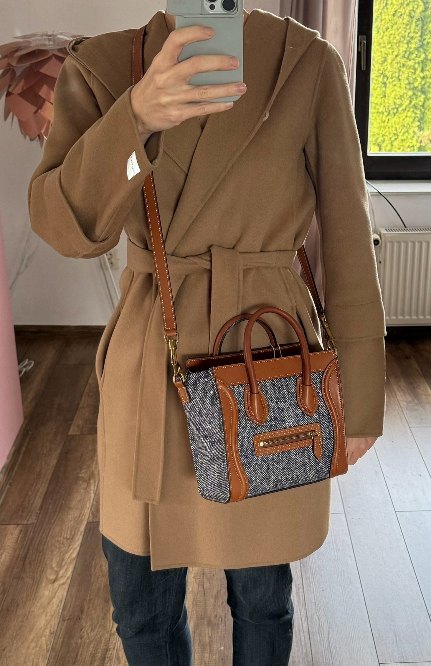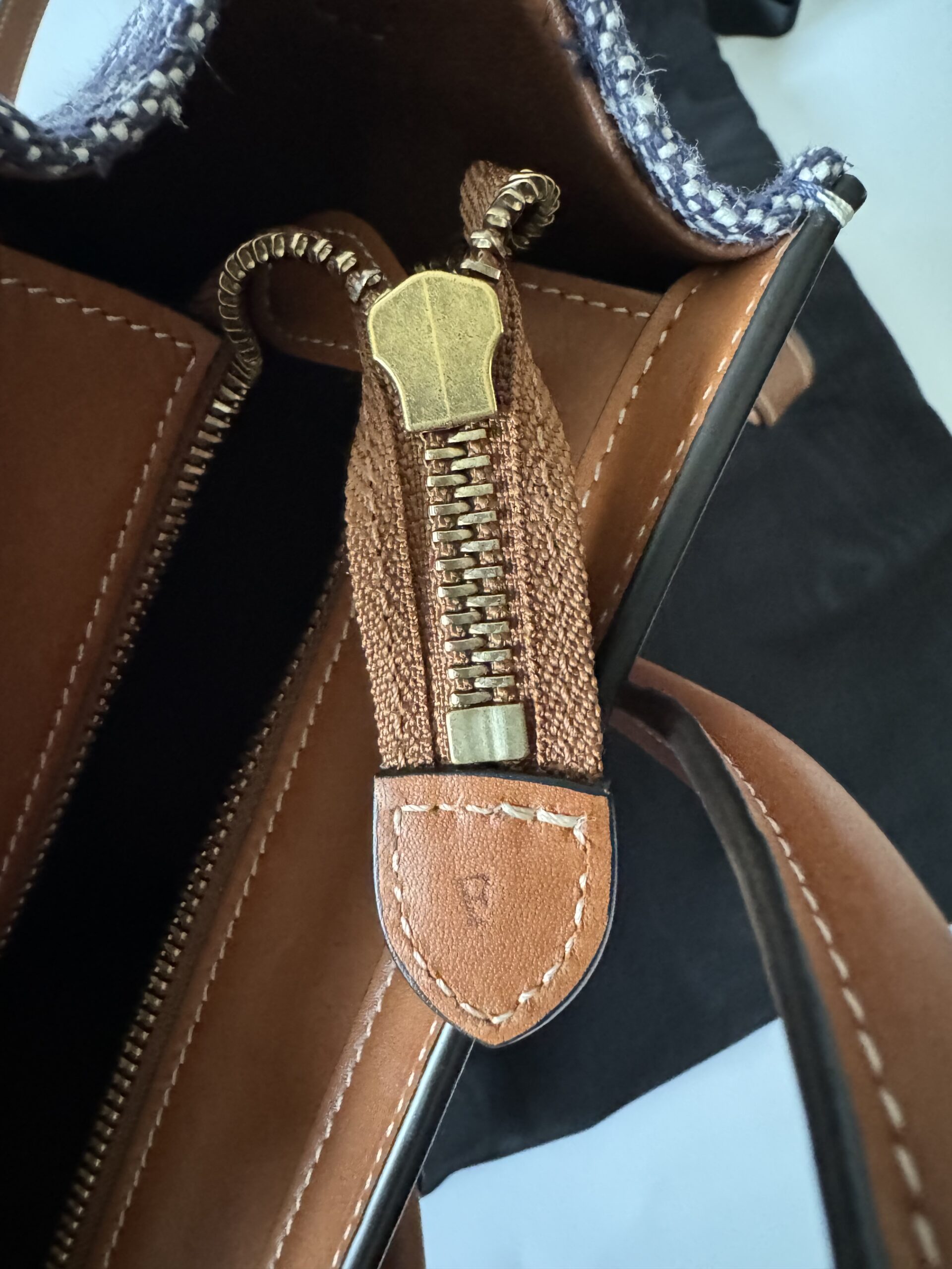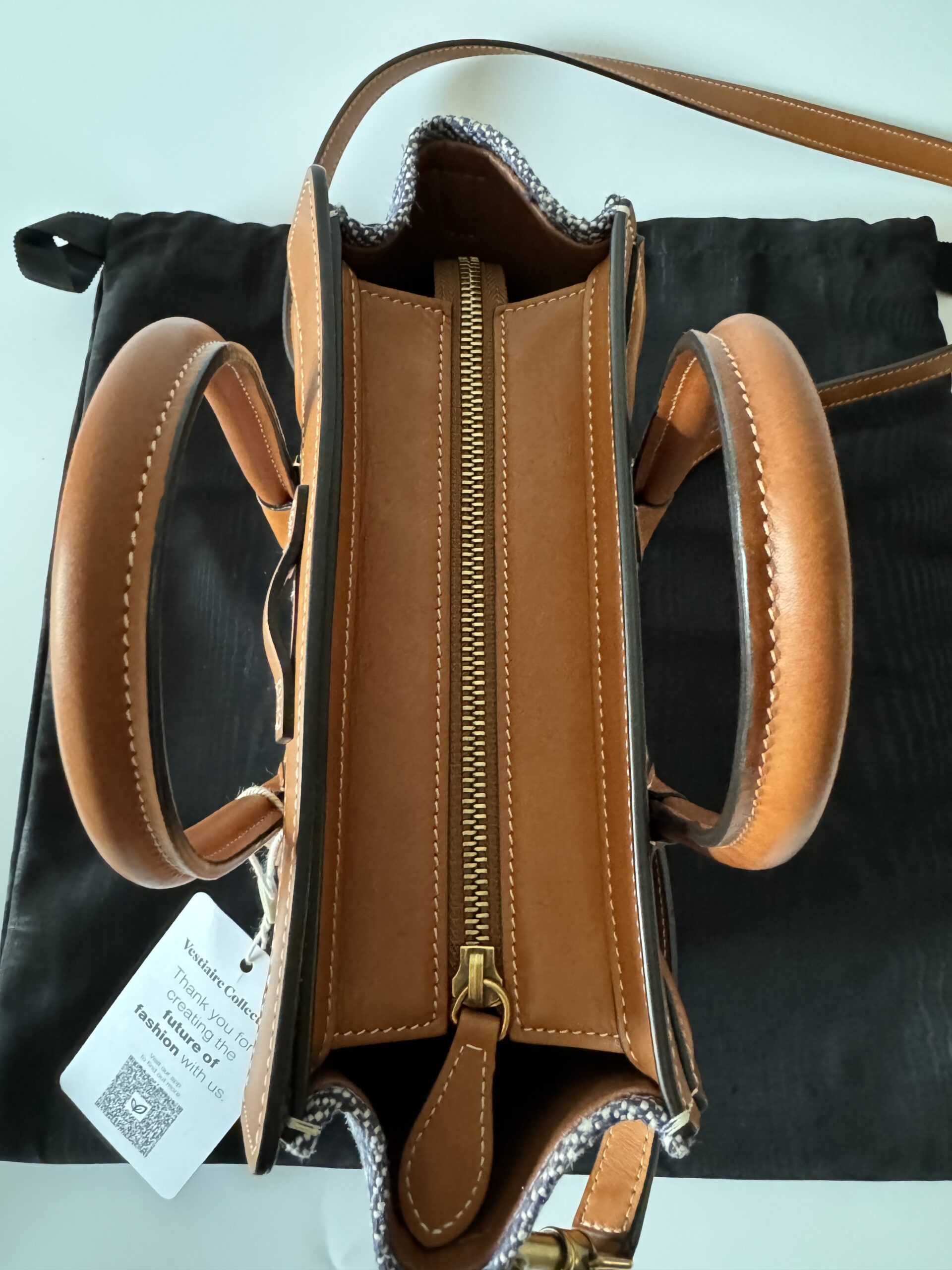 ▪️ Piękna torebka, ikoniczny model Celine, wykonana z połączenia skóry cielęcej w kolorze TAN (karmelowym) oraz płótna imitującego dżins w kolorze NAVY (bardzo ciemny, niemalże czarny melanż z białym).