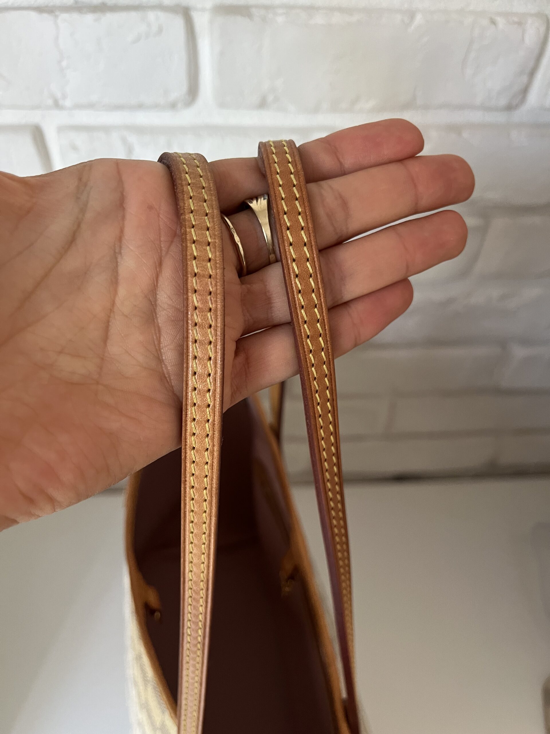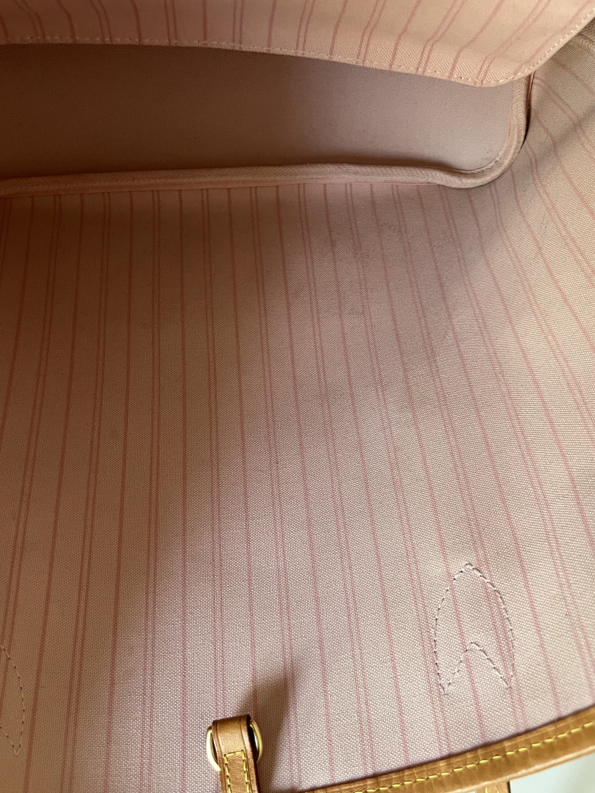 środek pochette czysty, w torebce bardzo delikatne przybrudzenia. Rogi torebki nie maja ubytków, zarówno jak rączki i czerwona lamówka rączek.
