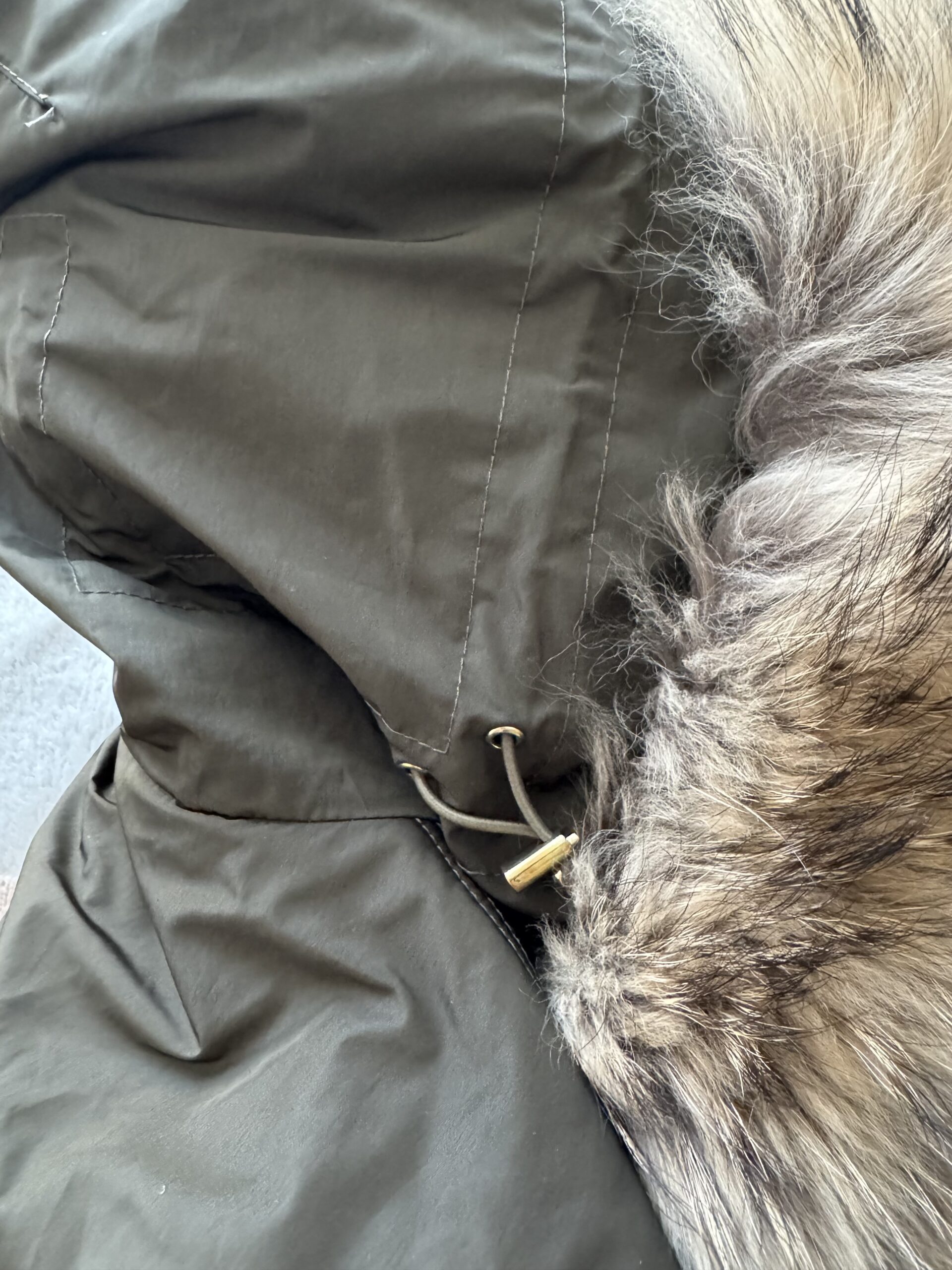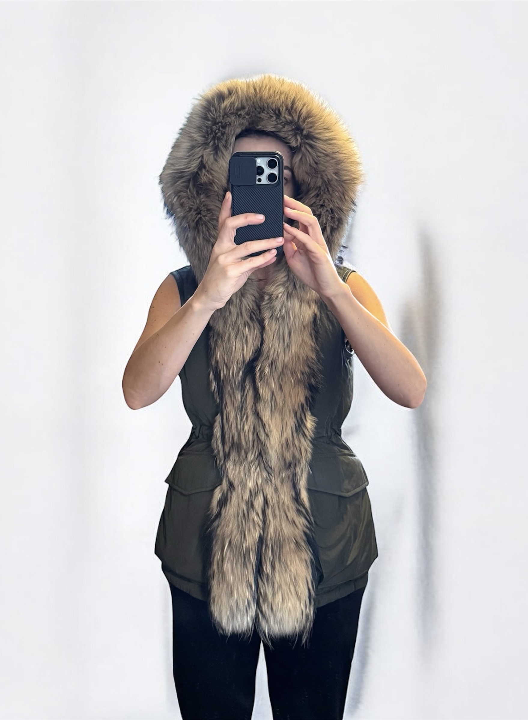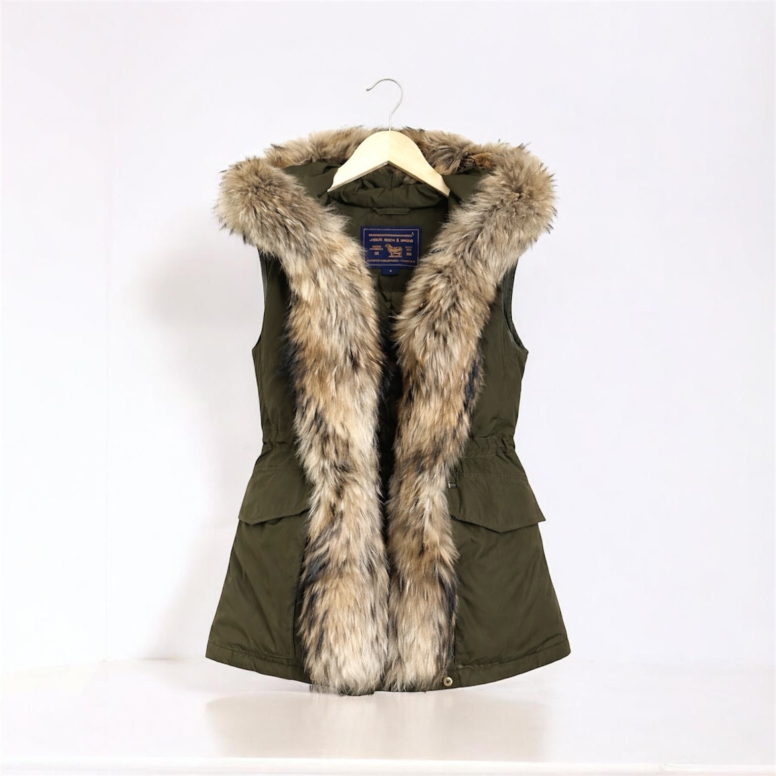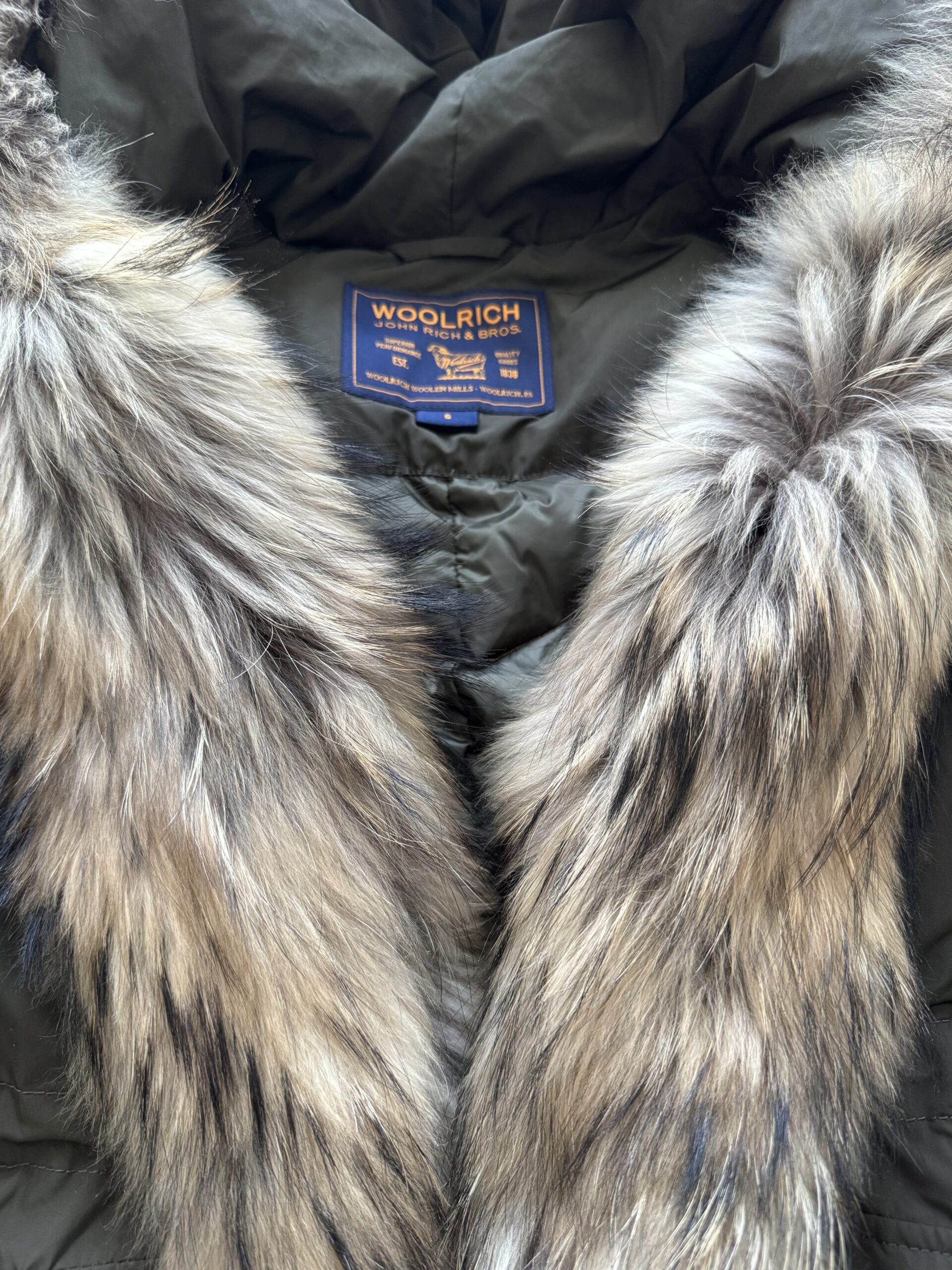 Oryginalna damska kamizelka renomowanej marki Woolrich w pięknym militarnym zielonym kolorze. Bardzo lekka, a jednocześnie ciepła dzięki naturalnemu wypełnieniu z puchu i pierza. Wykończona naturalnym futrem z jenota fińskiego. Idealna do noszenia samodzielnie lub w połączeniu z kurtkami, marynarkami, swetrami, sukienkami itp.